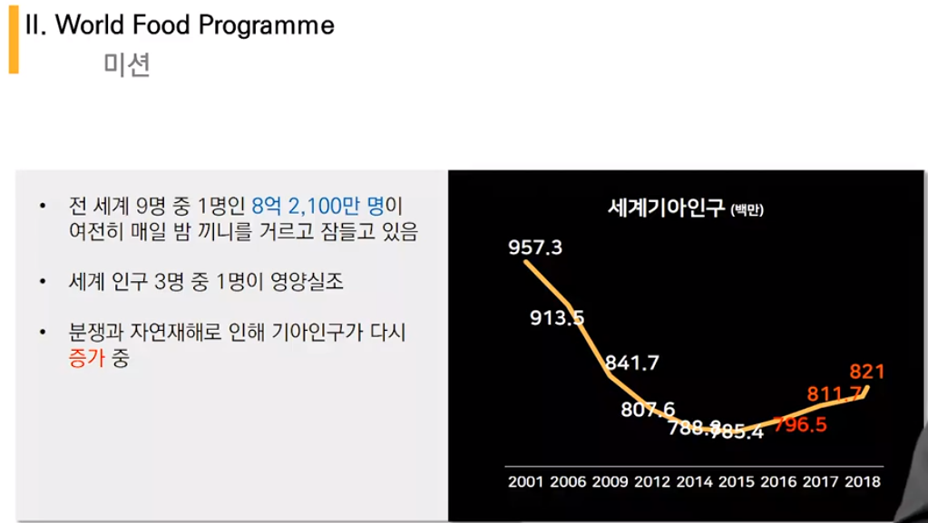 SDGs에서 전세계 기아를 없앤다는 목표를 세우고 있지만 2015년부터 기아인구가 꾸준히 증가하고 있는 추세이다. 이는 기후변화로 인한 식량생산성의 저하로 비롯된 것임을 유추해볼 수 있다.