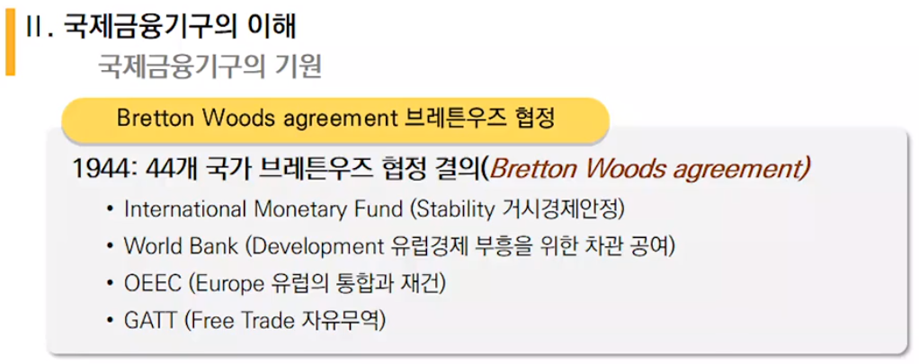 세계 2차대전이 끝나고 유럽 경제의 부흥을 위해 브레튼우즈 협정이 결의되었다. 국제금융기구가 처음부터 개발협력의 목표를 가지고 있는 것은 아니었다.